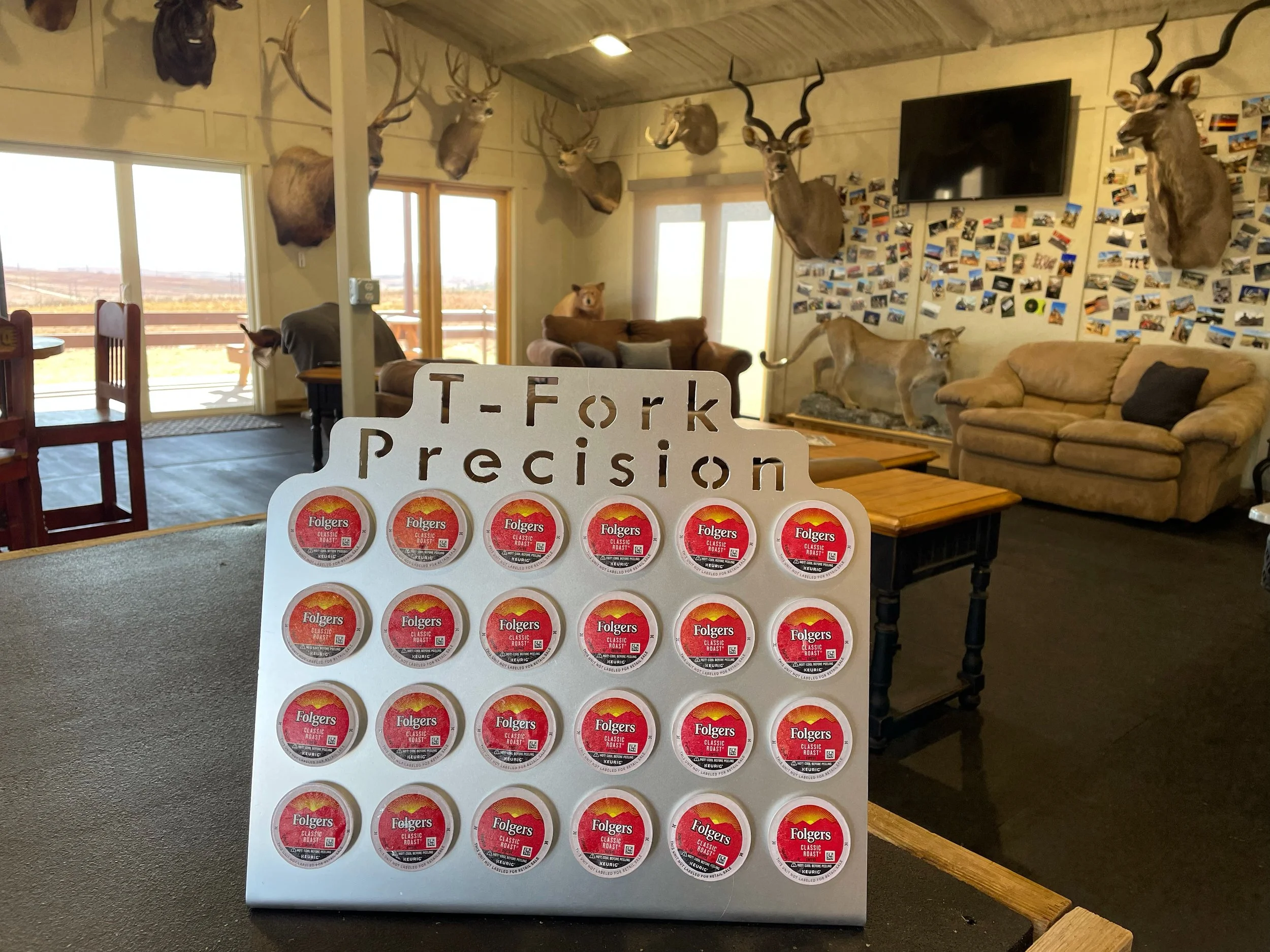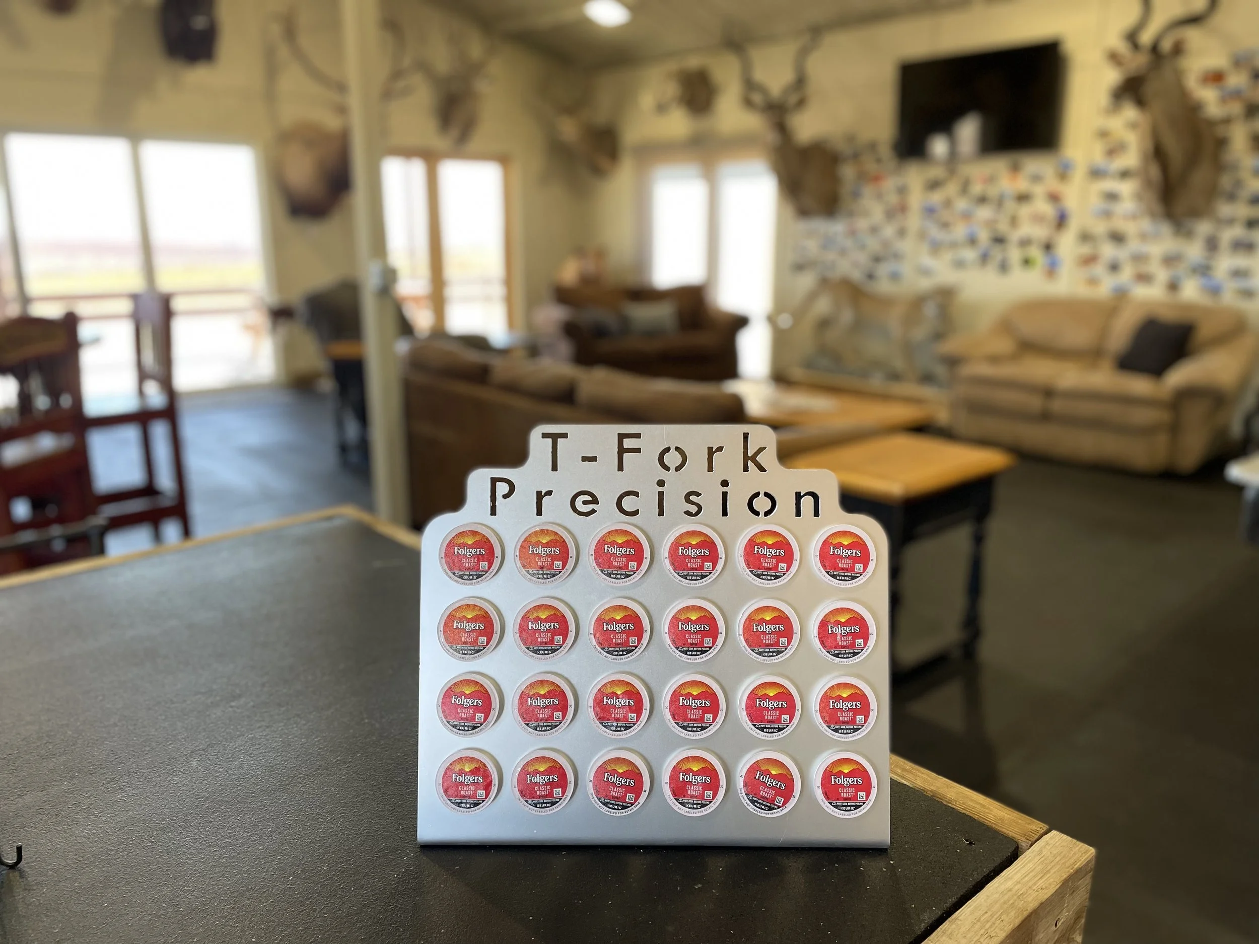 T-Fork Precision & Longrange accommodates hunters and long range students in their lodge all year long. They wanted a unique and useful way to organize and display their coffee pods for quick access so their guests could get right to their activities. Branded Metalworks was able to create exactly what they wanted to fill this gap in their guest kitchen.